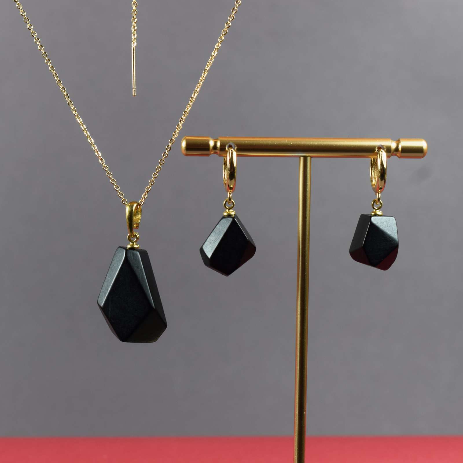 Juodo gintaro facetuoti elementai pasižymi subtiliu šviesos atspindžiu, kuris suteikia papuošalams gilumo ir prabangos pojūtį. Geometriškos formos kuria šiuolaikišką, išgrynintą įvaizdį, puikiai derantį tiek prie kasdienės, tiek prie vakarinės aprangos.