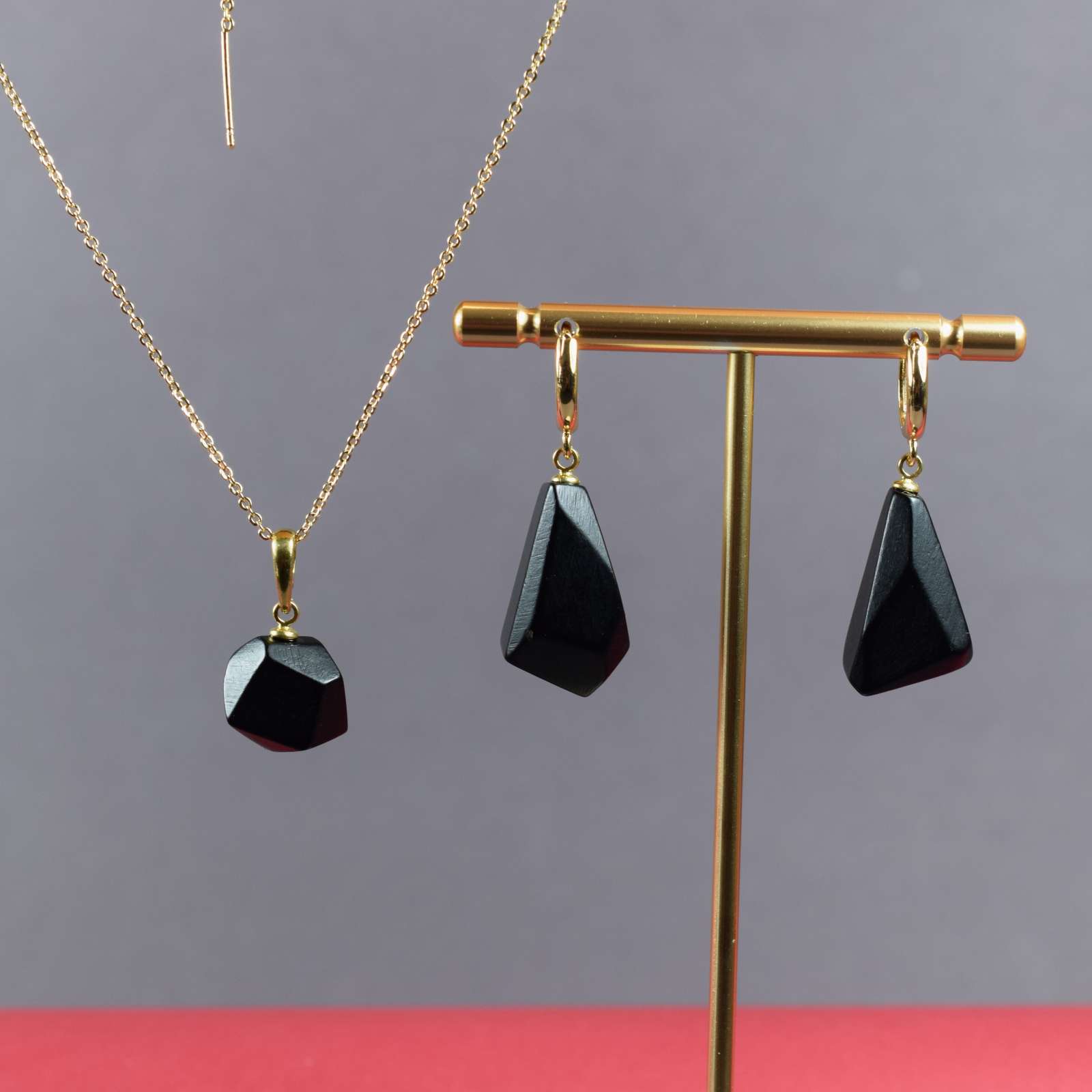 Modernus ir išskirtinis gintaro papuošalų rinkinys „Juodoji geometrija“ – elegantiškas pasirinkimas vertinančioms šiuolaikinį dizainą. Rinkinį sudaro facetuoti juodo gintaro auskarai ir pakabukas su subtilia paauksuota grandinėle.