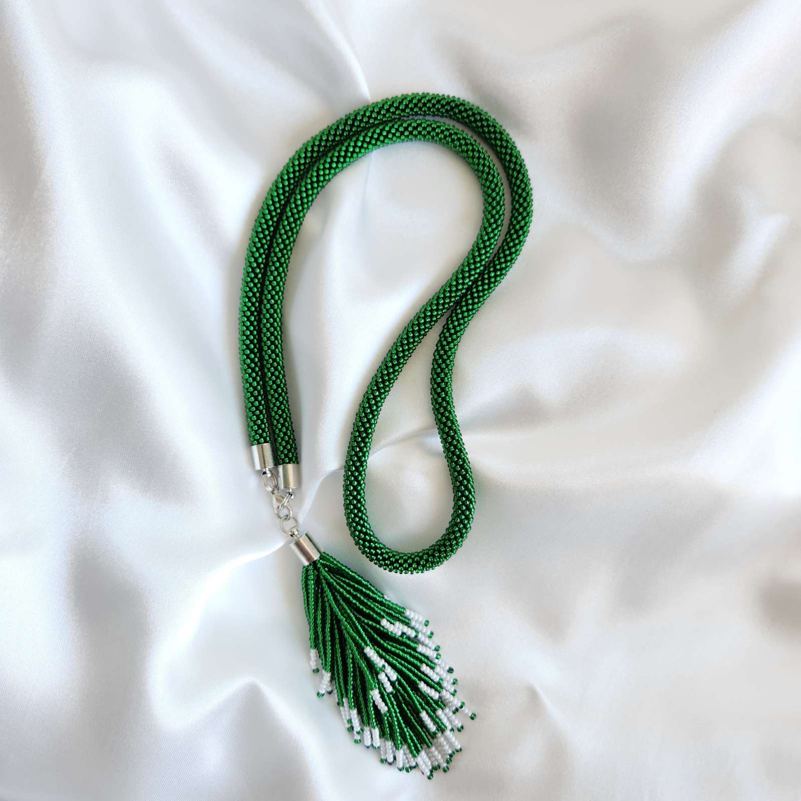 Vėrinys pagamintas iš čekiško biserio. Ilgis be kutuko 64 cm. Kutukas nusisega, jo ilgis 8 cm.