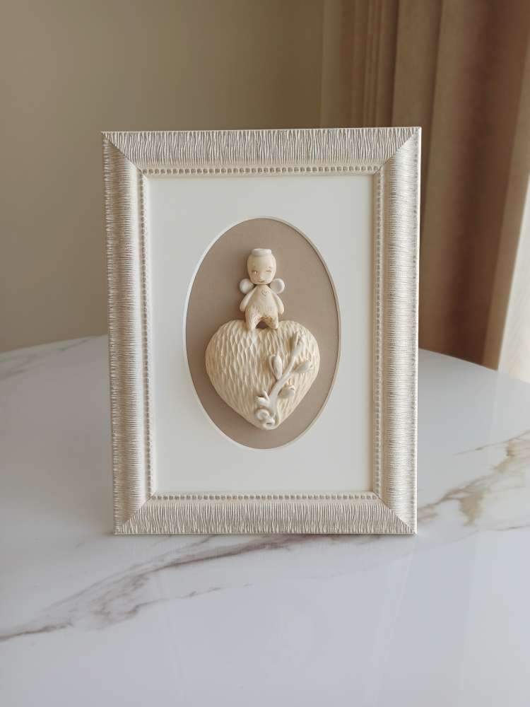 Subtilus ir švelnus dekoro akcentas – rankų darbo keramikinis angeliukas ant širdelės elegantiškame rėmelyje. Sukurtas su meile ir kruopštumu, jis simbolizuoja ramybę, apsaugą ir šviesą.