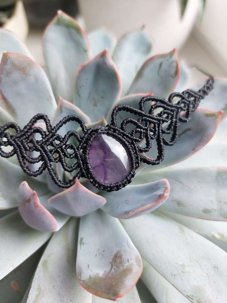 Rankų darbo macrame pakabutis su natūraliu Ametisto akmeniu. Pagaminta iš itin tvirto vaškuoto braziliško siūlo, ilgis reguliuojamas.