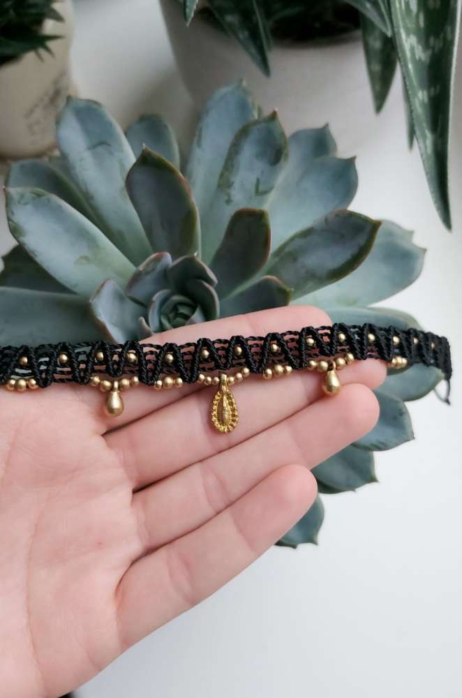 Rankų darbo macrame kojos apyrankė su žalvarinėmis detalėmis, pagaminta iš itin tvirto vaškuoto braziliško siūlo. Užrišimas su paprastu mazgeliu.