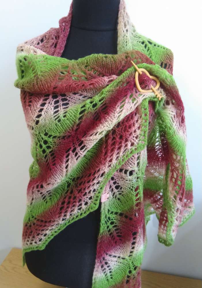 Skara megzta virbalais. Siūlų sudėtis - vilna 100%. Skaros ilgis 226 cm, aukštis 104 cm.