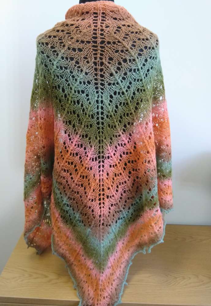Skara megzta virbalais. Siūlų sudėtis - vilna 100%. Skaros ilgis 243 cm, aukštis 110 cm.