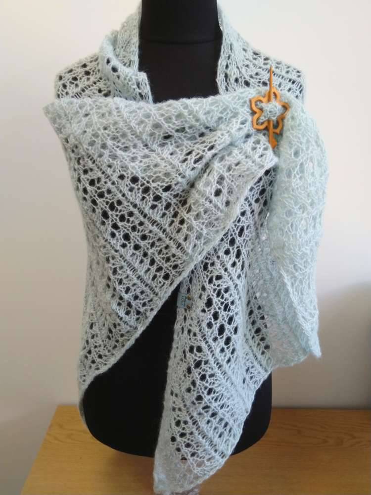 Skara megzta virbalais. Siūlų sudėtis - vilna 100%. Švelniai melsvos spalvos. Skaros ilgis 209 cm, aukštis 104 cm.