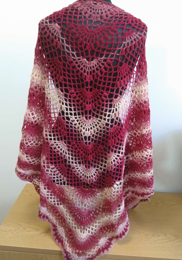 Skara nerta vašeliu. Siūlų sudėtis - vilna 100%. Skaros ilgis 225 cm, aukštis 103 cm.