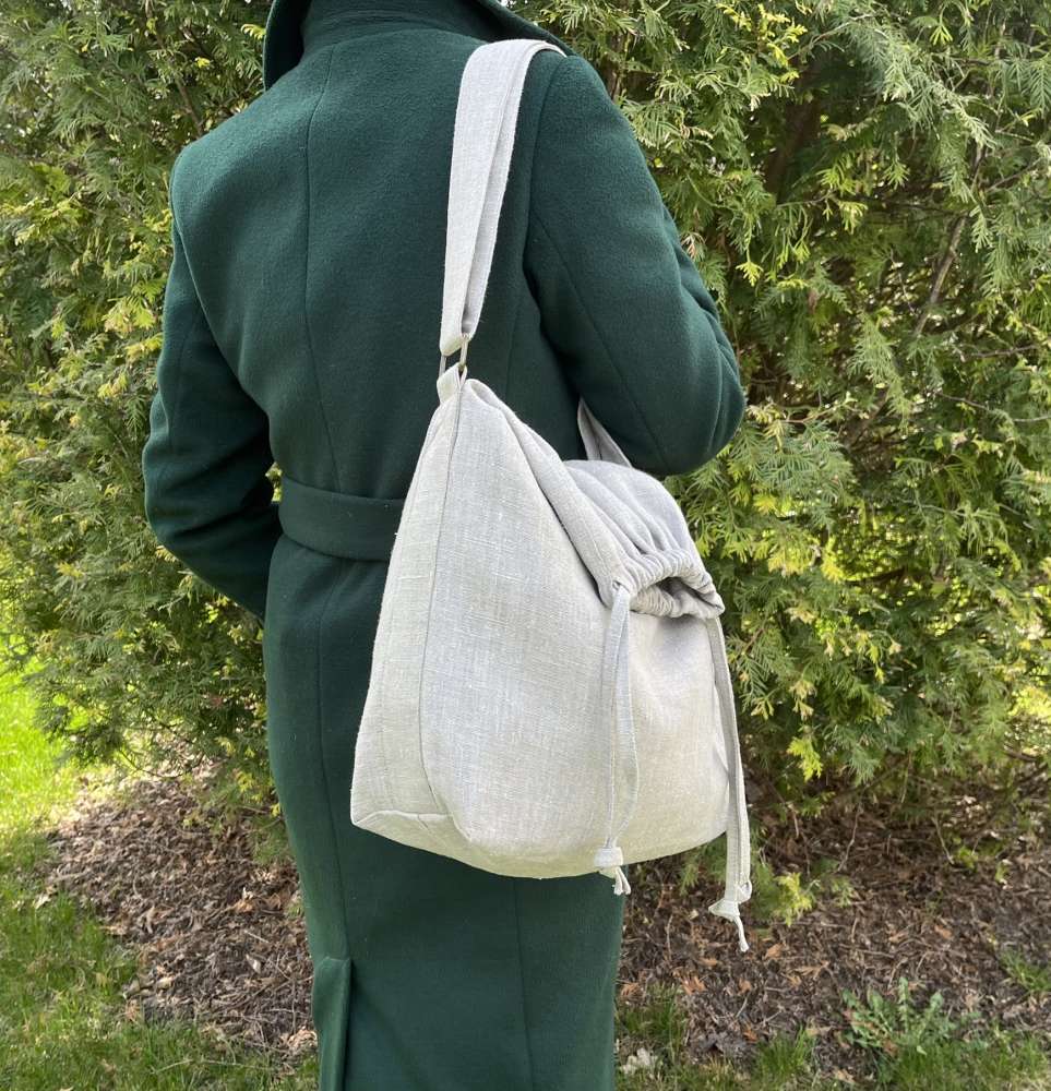 Dvisluoksnis lininis krepšys su raišteliais ir reguliuojamu dirželiu.