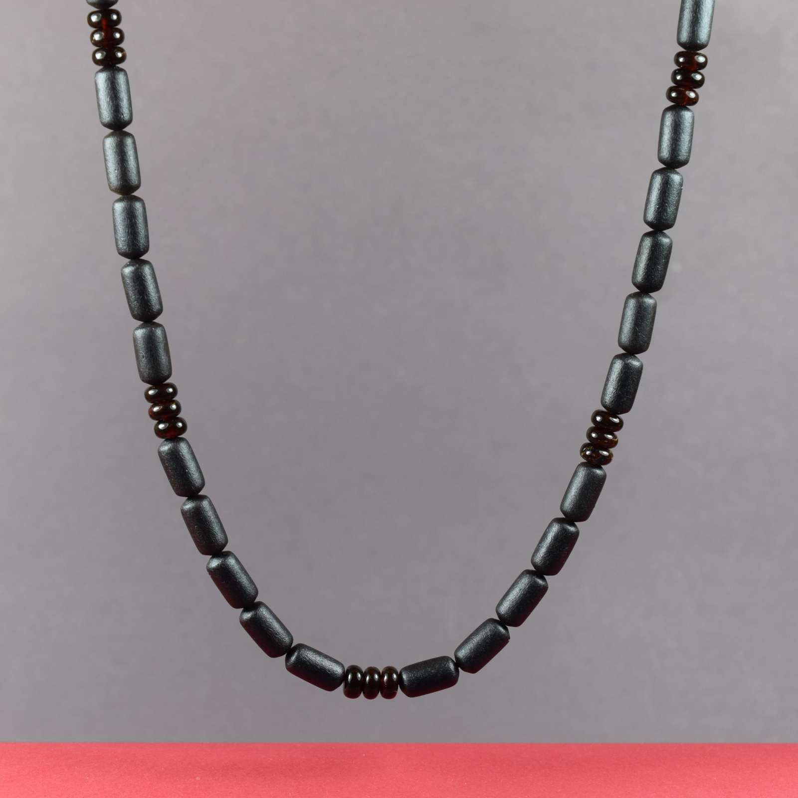Stilingi ir subtiliai išskirtiniai vyriški gintariniai karoliai „Juodasis šerkšnas Balance“ – harmoningas minimalizmo ir natūralaus grožio derinys. Karoliai suverti iš matinio juodo gintaro cilindrinių karoliukų, kuriuos papildo tamsesnio vyšninio gintaro intarpai.