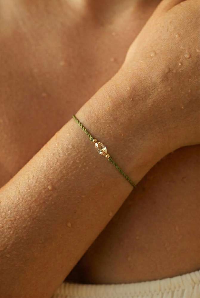 Minimalistinė siūlo apyrankė su kristalu sukurta iš kokybiškų medžiagų. Dydis yra univeralus, reguliuojamas virvelėmis. Apyrankė labai patogi, jos visiškai nesijaučia, su ja galima miegoti ir ilgai nenusiimti, tinka kasdienai arba progoms.