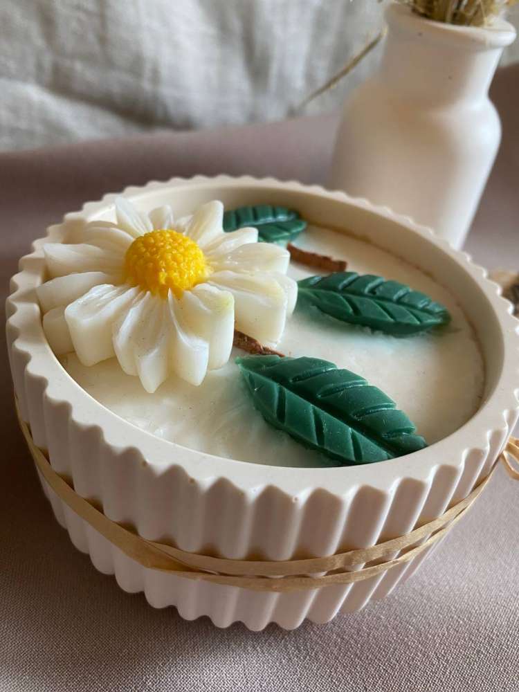 Rankų darbo sojų vaško žvakė su subtiliu ramunės žiedo dizainu. Natūrali, estetiška ir jauki, ši žvakė ne tik papuoš interjerą, bet ir pripildys namus pasirinktu aromatu. Puikiai tinka atsipalaidavimui ar dovanai.